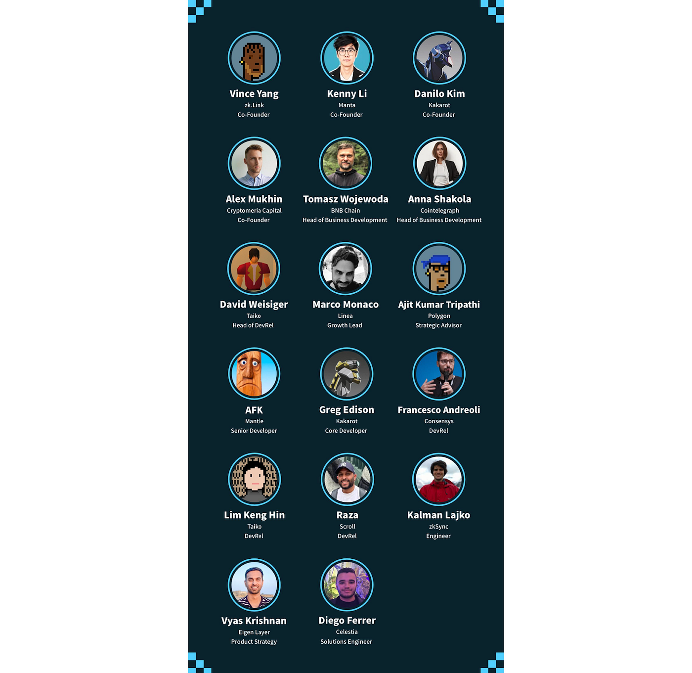 Our L3 Summit has attracted the attention of many of the industry’s heavyweights and prominent protocols. These include leading Layer 2s such as Arbitrum, Linea, Mantle, Polygon zkEVM, Metis, Scroll, Starknet, and zkSync — Innovative modular blockchain solutions such as Celestia, Eigen Layer, and Manta — Rising zkEVM solutions such as Kakarot and Taiko — And finally, Layer 2 Ordinals such as L2O Consortium, ZKP systems such as Polyhedra, oracle providers such as Pyth Network, and zk-Native blockchain protocols such as QED.